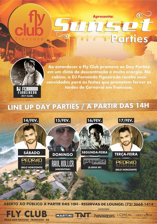 Ao entardecer o Fly Club promove as Day Parties em um clima de descontração e muita energia. Na cabine, o Dj Fernando Fugueiredo recebe seus convidados para as festas que prometem ferver as tardes de Carnaval em Trancoso!