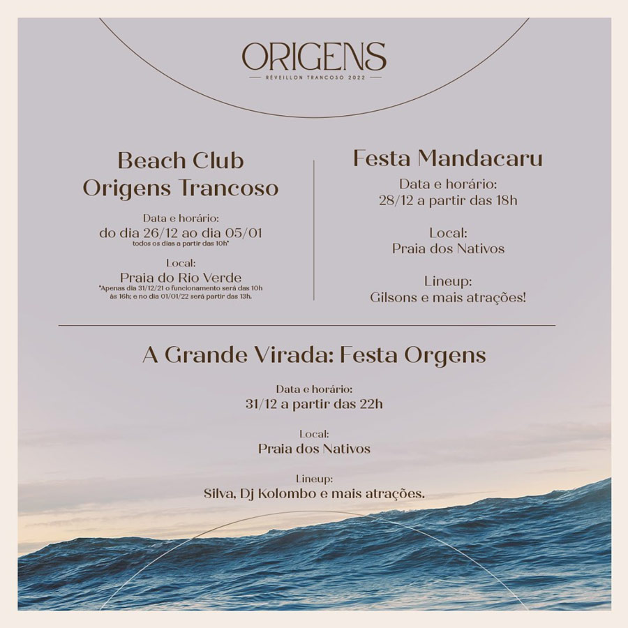 - dia 31/12: A Grande Virada, Festa ORIGENS TRANCOSO 2022, a partir das 22:00hrs, na Praia dos Nativos